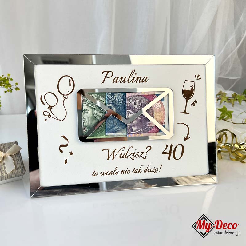 Czy szukasz wyjątkowego prezentu urodzinowego, który zostanie zapamiętany na długie lata? Poznaj naszą niezwykłą Ramkę Personalizowaną na Pieniądze! Ta elegancka ramka to nie tylko praktyczny sposób na przechowywanie ważnych wspomnień, ale również wyjątkowy element dekoracyjny, który zachwyci każdego. Ramka ma wymiary 27×19 cm, wyróżnia się niezwykłym detalem — kopertą wyciętą z lustrzanego srebrnego pleksi, która dodaje jej luksusowego charakteru i sprawia, że prezent nabiera wyjątkowego blasku. Wszystko, co musisz zrobić to włożyć do środka koperty właściwe banknoty odpowiadającymi wiekowi obdarowywanej osoby. Ramka ta jest elementem dekoracyjnym dlatego też śmiało może być eksponowana na komodzie, biurku lub gablocie.