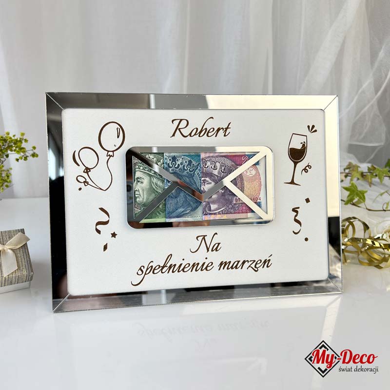 Czy poszukujesz niezapomnianego prezentu urodzinowego, który pozostanie w pamięci na lata? Oto nasza wyjątkowa propozycja – Ramka Personalizowana na Pieniądze! Ta elegancka ramka nie tylko doskonale przechowuje ważne wspomnienia, ale również stanowi wyjątkowy element dekoracyjny, który z pewnością zachwyci każdego. O wymiarach 27×19 cm, wyróżnia się ona niezwykłą kopertą wyciętą z lustrzanego srebrnego pleksi, dodając ramce luksusowy charakter i nadając prezentowi wyjątkowego blasku. Wystarczy umieścić w kopercie odpowiednie banknoty, odpowiadające wiekowi solenizanta. Ramka ta stanowi także atrakcyjny element dekoracyjny, idealny do eksponowania na komodzie, biurku lub gablocie.