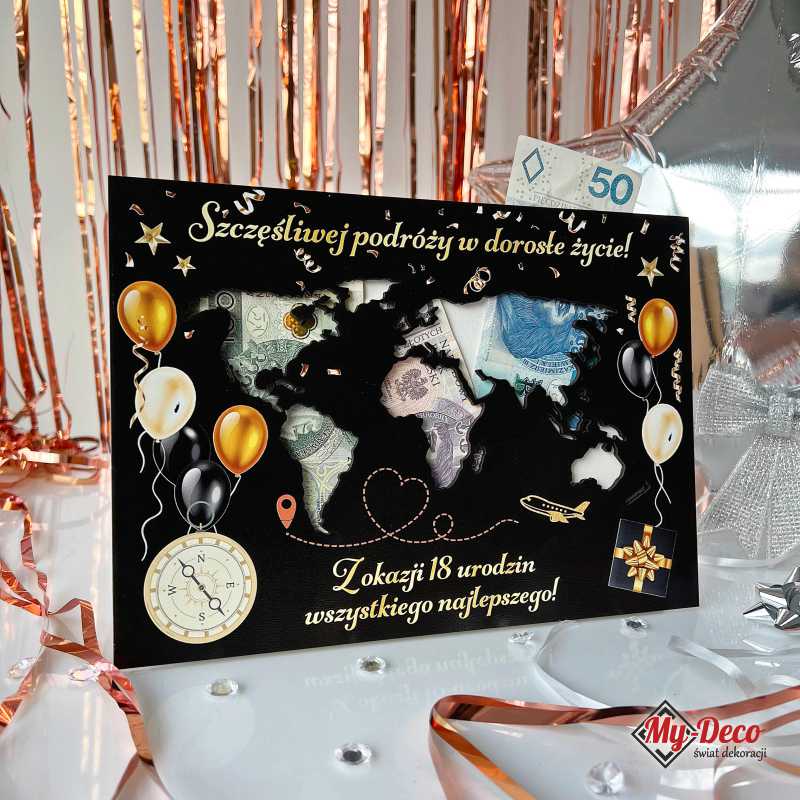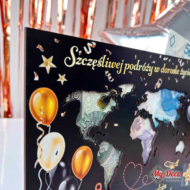 Ramka na pieniądze z mapą świata ♥ Prezent na Osiemnastkę dla chłopaka i dziewczyny.