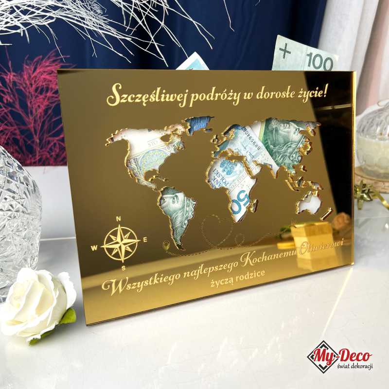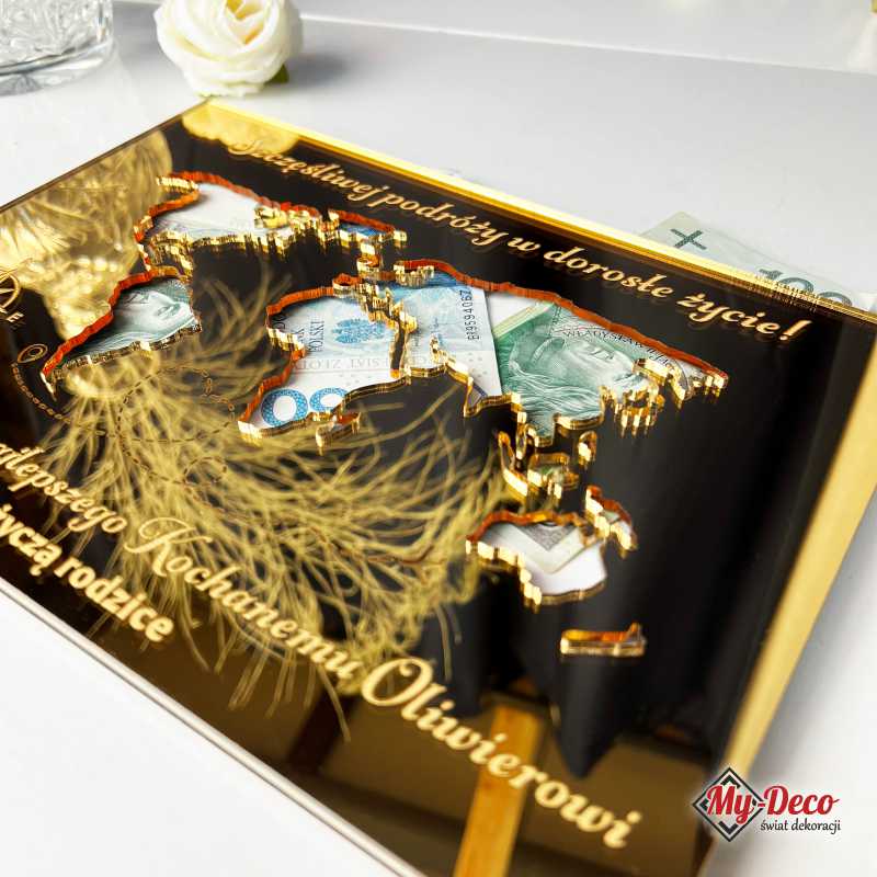 Wprowadź do swojego życia odrobinę luksusu dzięki naszej eleganckiej ramce na pieniądze z wyciętą mapą świata. Wykonana z błyszczącej złotej pleksi lustrzanej, ta ramka nie tylko przechowuje finanse, ale również emanuje stylem i elegancją. Jej wymiary 27×19 cm pozwalają na umieszczenie hojnych darowizn, tworząc jednocześnie unikalną ozdobę, która zachwyci nie tylko jubilata, ale także całą rodzinę.