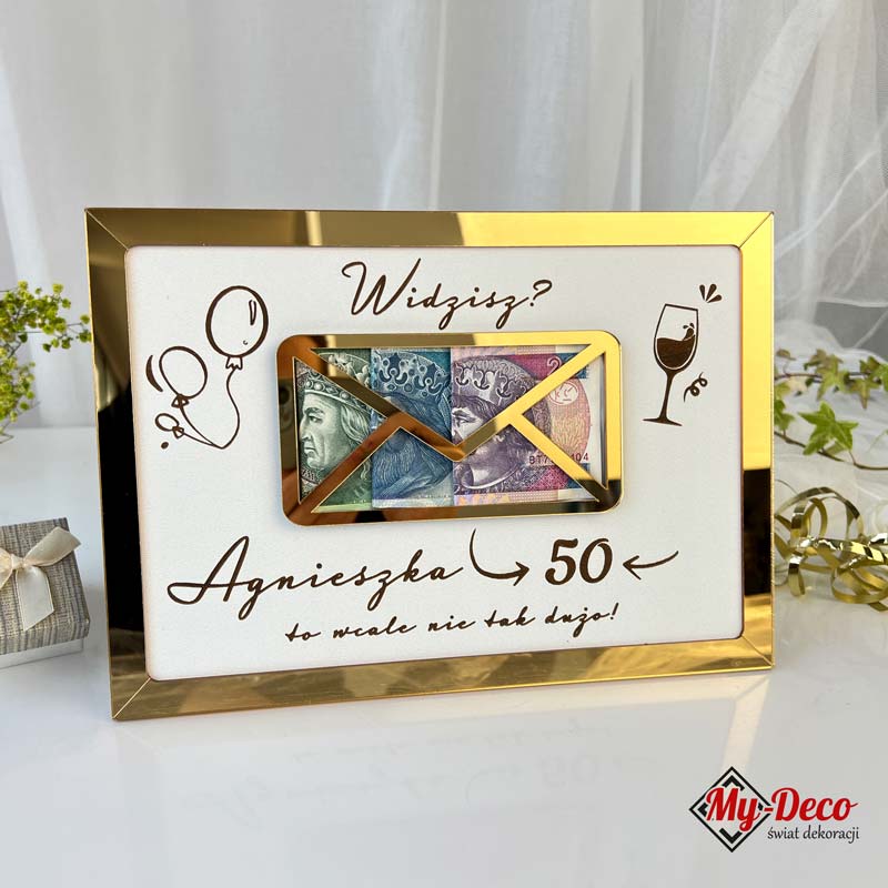 Czy szukasz wyjątkowego prezentu urodzinowego, który zostanie zapamiętany na długie lata? Poznaj naszą niezwykłą Ramkę Personalizowaną na Pieniądze! Ta elegancka ramka to nie tylko praktyczny sposób na przechowywanie ważnych wspomnień, ale również wyjątkowy element dekoracyjny, który zachwyci każdego. Ramka ma wymiary 27×19 cm, wyróżnia się niezwykłym detalem — kopertą wyciętą z lustrzanego złotego pleksi, która dodaje jej luksusowego charakteru i sprawia, że prezent nabiera wyjątkowego blasku. Wszystko, co musisz zrobić to włożyć do środka koperty właściwe banknoty odpowiadającymi wiekowi obdarowywanej osoby. Ramka ta jest elementem dekoracyjnym dlatego też śmiało może być eksponowana na komodzie, biurku lub gablocie.