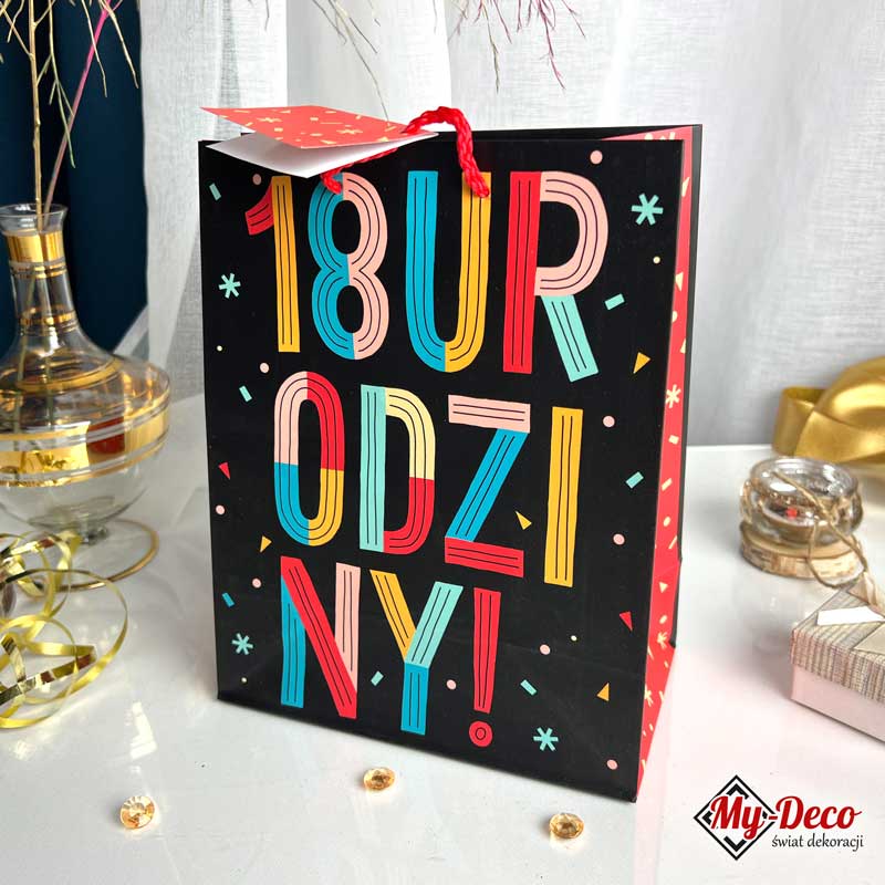 Nasza “Kolorowa Magia Pełnoletności” to nie tylko torba prezentowa; to doskonałe opakowanie na prezent 18, które dodaje niepowtarzalnego charakteru każdej urodzinowej celebracji. Zapakuj swoje życzenia, prezenty i emocje w tę torbę, aby uczynić moment pełnoletności wyjątkowym.